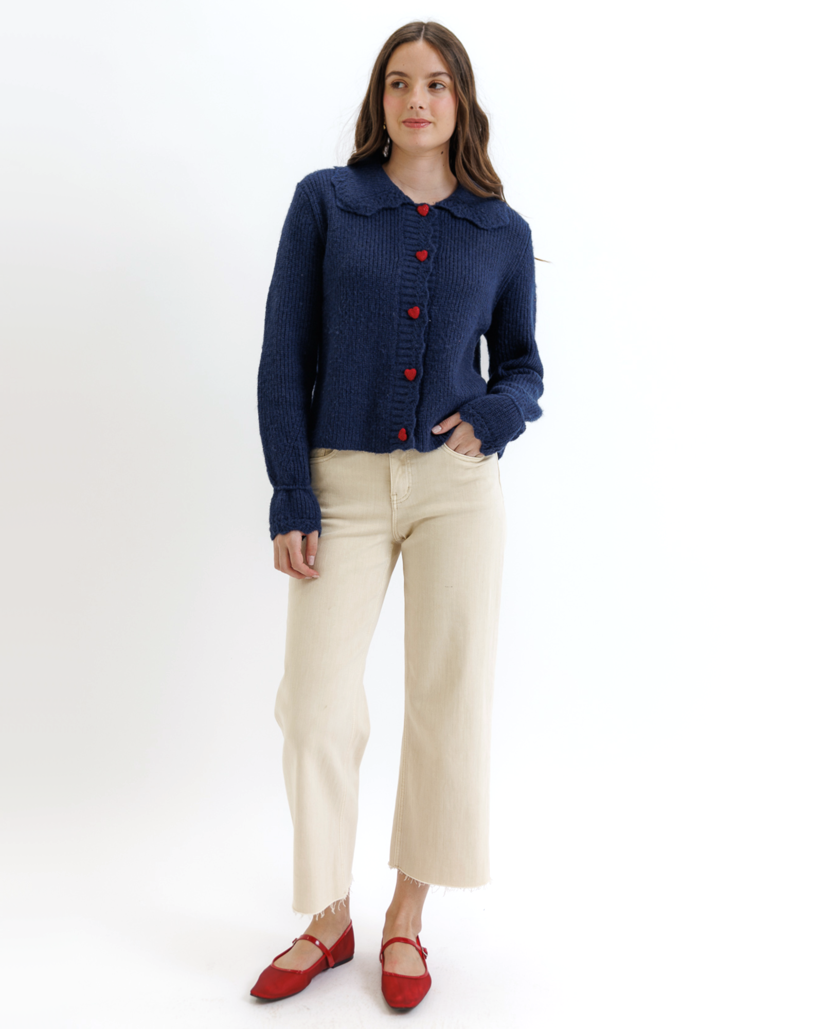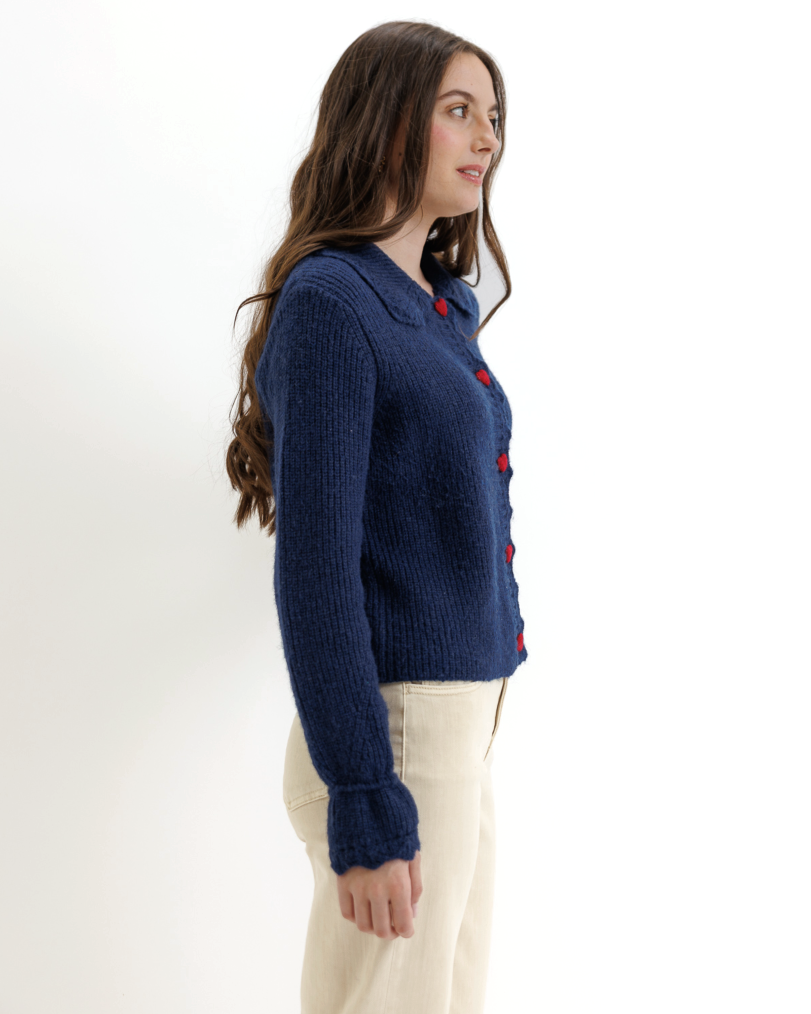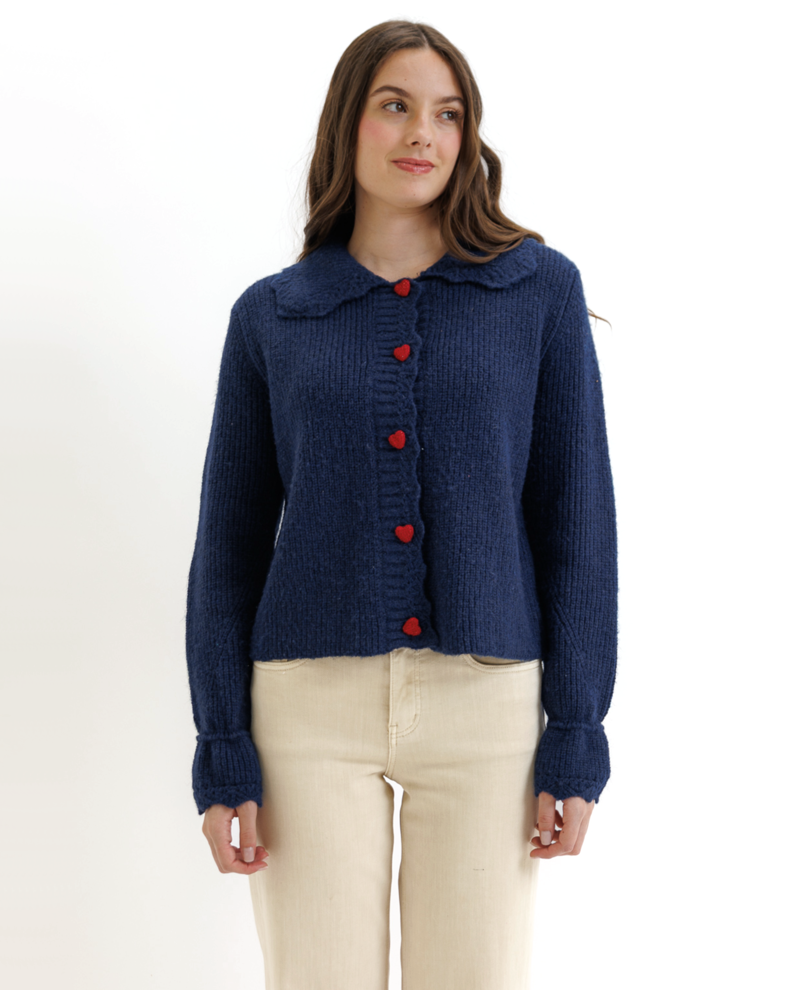 - Button down cardigan with red heart-shaped button