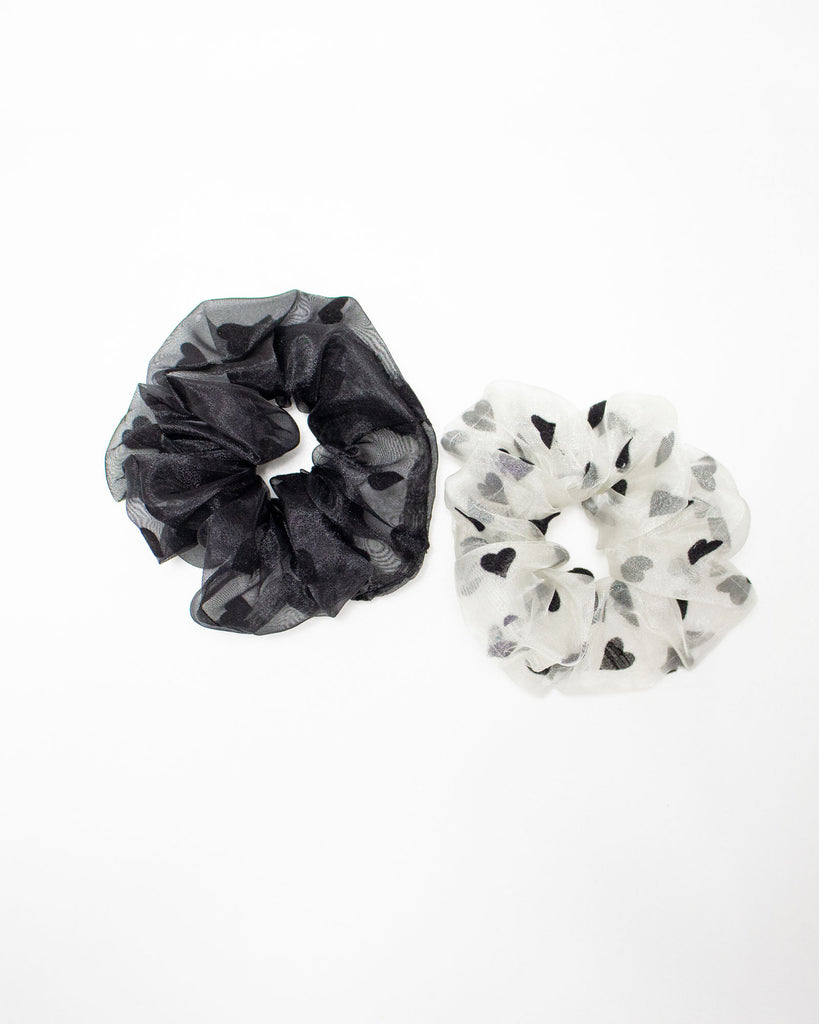 Black and white scrunchies with black hearts