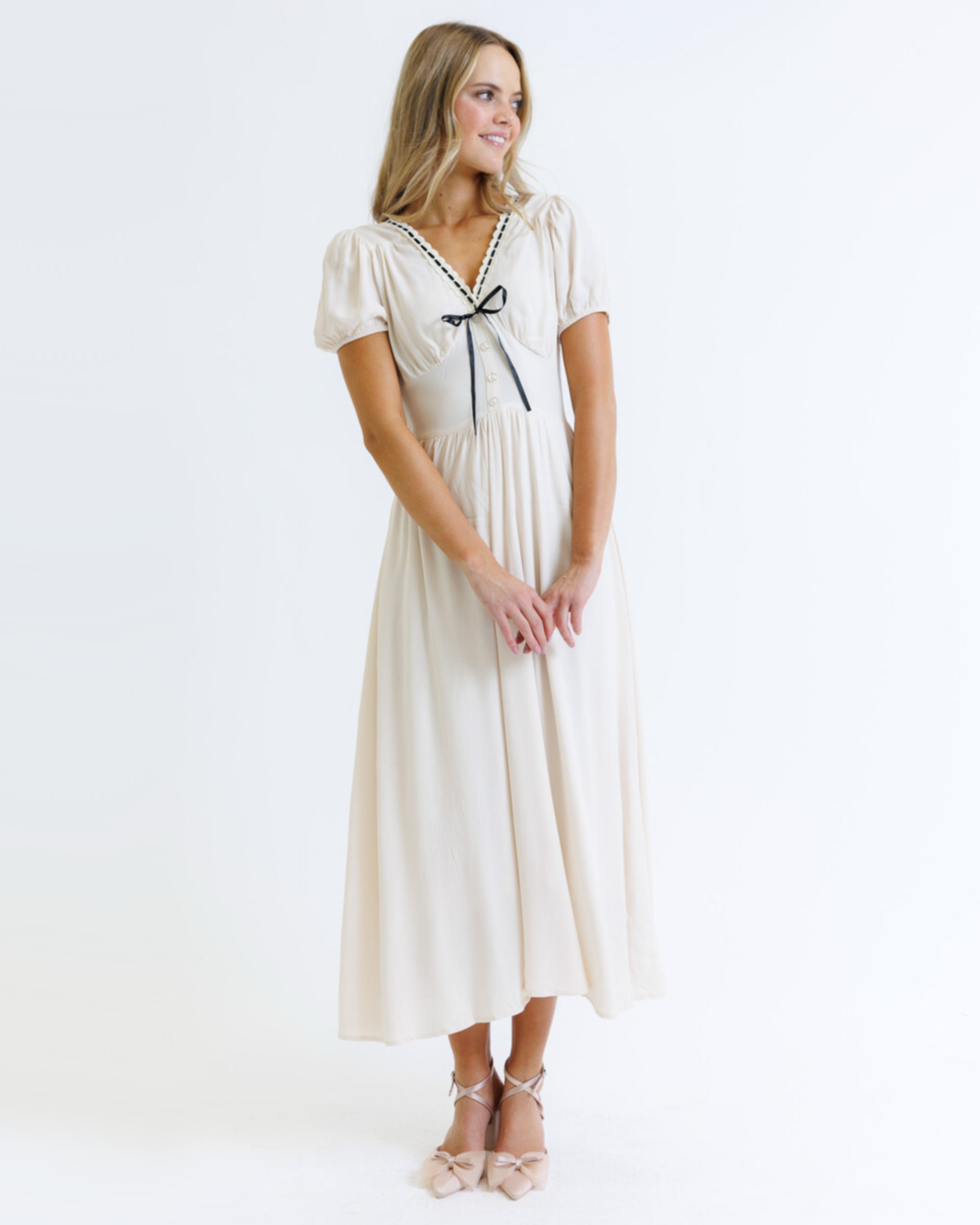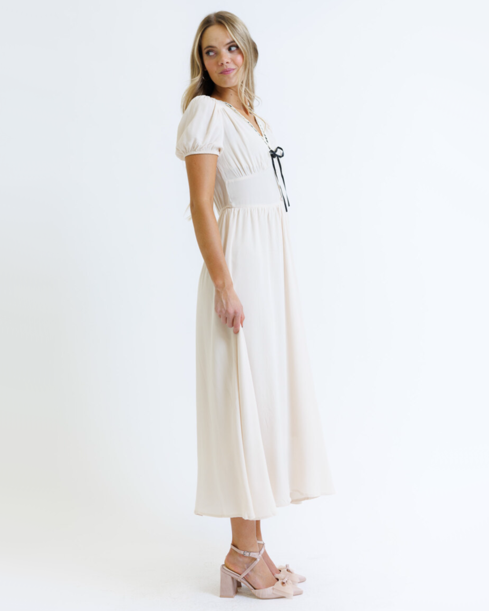 • V-neckline with black ribbon detail